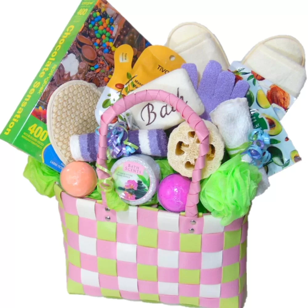 Spa gift basket purse pink large purse basket 12 inches green, white and pink checkered. Gift basket filled with: Beige spa slippers, avocado face mask, coconut face mask, white face towel, green bath puff, loofa, lavender infused bath glove, bath sponge, argan oil hand mask, melon bath bomb, lavender rosemary bath bomb, purple and white strips face towel, bath pad, bath scents pumice stone and chocolate puzzle 400 pieces. Free Toronto Delivery